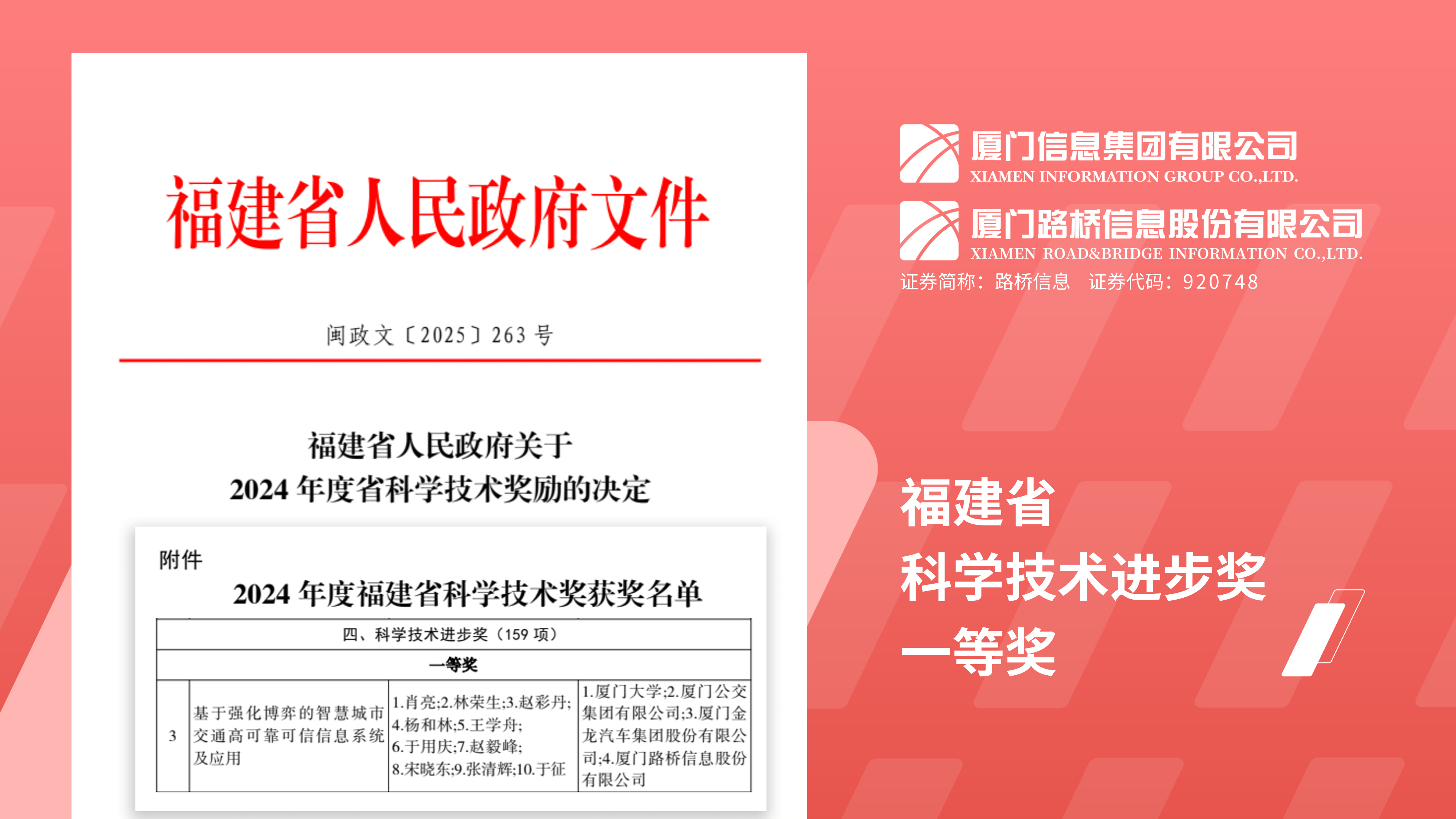 近日,福建省人民政府发布关于2024年度省科学技术奖励的决定,厦门信息集团成员企业厦门路桥信息股份有限公司(以下简称“路桥信息”)参与的“基于强化博弈的智慧城市交通高可靠可信信息系统及应用”获评福建省科学技术进步奖一等奖。 “基于强化博弈的智慧城市交通高...